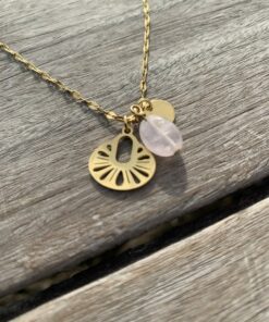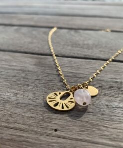 Chaîne fine en acier doré pour avec pierre naturelle de quartz rose. Le collier se compose d’une pierre ainsi que d’une médaille dorée en acier.